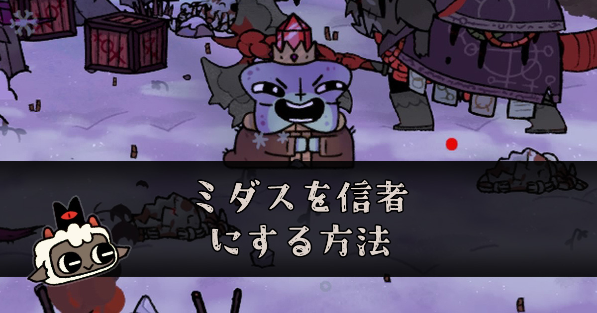 ただいまDLC攻略中で、現段階でわかる内容で記載しています!情報頂ける場合は、コメントまでお願いします!! Cult of the Lamb(カルトオブザラム)でミダスを信者にする方法です。教団の仲間にするまでの手順や注意点をまとめています。 ミダスを仲間にする方法 1 【事前】DLC「Woolhaven」を有効にし、ストーリーを進める このイベントは有料DLC「Woolhaven」に含まれるものです。まずはWoolhaven内の聖戦をプレイし、ストーリーを進行させましょう。 ▶Woolha ...